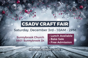 Find out more »Join us for the CSADV Craft Fair on Saturday, December 3rd from 10am to 2pm at Sunnybrook Church - admission is free! Lunch will be available, and there will be a bake sale. All proceeds benefit CSADV.