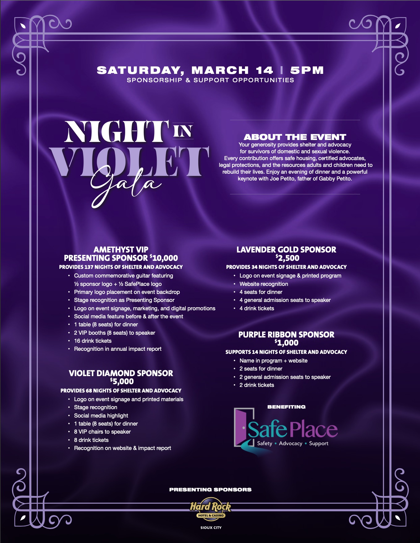For more information or for purchasing corporate sponsorships, contact Sam or Kitt at SafePlace office at: 712-277-0131